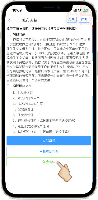 往年已納入的扶助對(duì)象需要進(jìn)行年度確認(rèn)。請(qǐng)本人于3—4月份攜帶身份證、戶口簿到村(居)進(jìn)行現(xiàn)場(chǎng)認(rèn)證;企業(yè)退休和城鎮(zhèn)無用人單位獎(jiǎng)扶對(duì)象,可在現(xiàn)場(chǎng)認(rèn)證后,由工作人員指導(dǎo)認(rèn)證人登錄愛山東App點(diǎn)擊“年度確認(rèn)”按鈕進(jìn)行確認(rèn)。