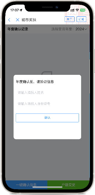 2.錄入城市獎(jiǎng)扶對(duì)象的姓名、身份證號(hào),點(diǎn)擊確認(rèn)按鈕,進(jìn)入年度確認(rèn)頁面。