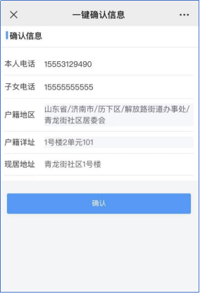 4.一鍵確認(rèn)信息。查看頁面中的本人電話、子女電話、現(xiàn)居地址信息,如果信息無誤,點(diǎn)擊確認(rèn)按鈕;如果信息有誤,刪除原有數(shù)據(jù)后填入最新信息,點(diǎn)擊確認(rèn)按鈕,完成本年度信息確認(rèn)工作。