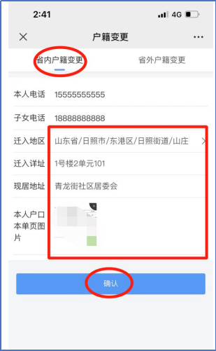 5.如果發(fā)生省內(nèi)的戶籍變動(dòng),在頁面上方點(diǎn)擊省內(nèi)戶籍變更,在遷入地區(qū)一欄,選擇最新的戶籍地至村級(jí)單位;在遷入詳址一欄錄入戶籍詳細(xì)地址,上傳本人戶口本圖片作為遷移證明材料。如果本人電話、子女電話、現(xiàn)居地址信息有誤,進(jìn)行更新。更新信息后,點(diǎn)擊“確認(rèn)”按鈕,完成本年度信息確認(rèn)。