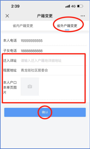 6.如果發(fā)生省外的戶籍變動(dòng),需在頁面上方點(diǎn)擊省外戶籍變更,在遷入詳址一欄錄入戶籍詳細(xì)地址;如果本人電話、子女電話、現(xiàn)居地址信息有誤,需進(jìn)行手動(dòng)更新,更新信息后,點(diǎn)擊“確認(rèn)”按鈕,完成本年度信息確認(rèn)工作。