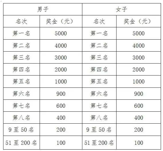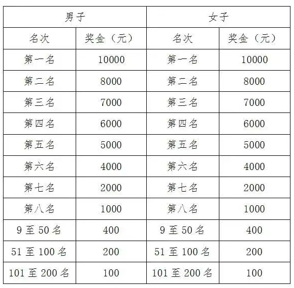 總成績男、女前三名運動員(按槍聲成績)四至二百名運動員(按凈計時成績),分別獲得獎金(單位:人民幣)。