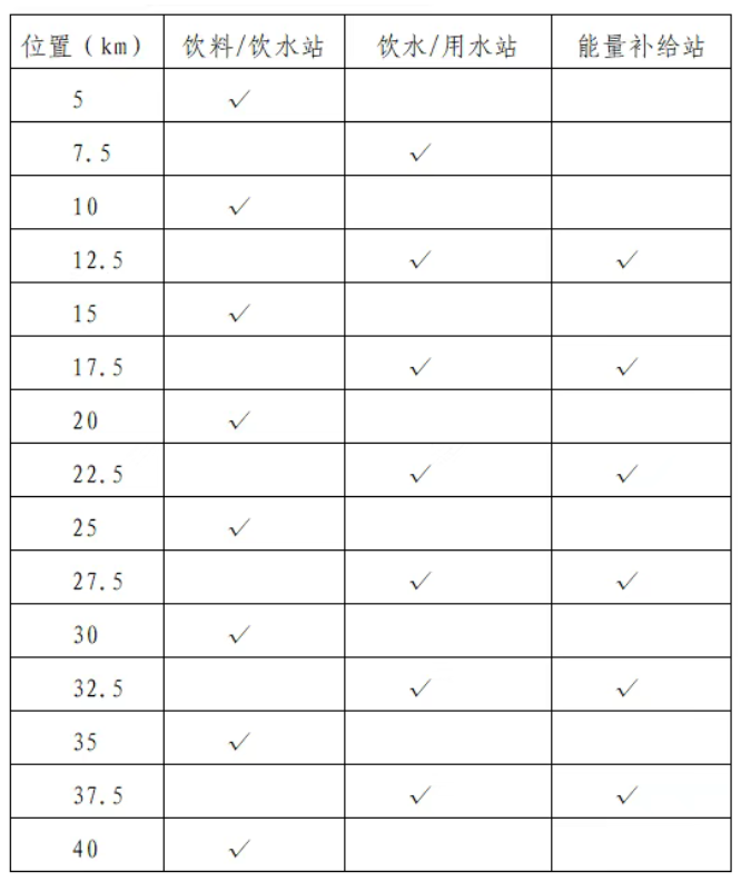 組委會在起終點、賽道沿途設有飲料、飲水、用水站及能量補給站。具體分布如下: