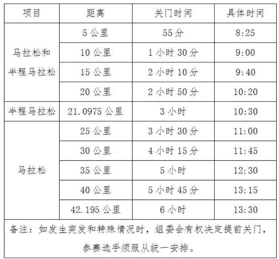為保證參賽運動員比賽安全、順利,限時對社會交通進行滾動封閉。比賽路線各段專設了賽事關門時間,到了關門時間,相應公里點的計時毯停止工作,相應路段將恢復社會交通。在規定時間內,未跑完對應距離的參賽運動員須立即停止比賽,退出賽道,以免發生危險。退出比賽的參賽選手可搭乘沿途的收容車抵達終點或自行選乘公共交通離開。