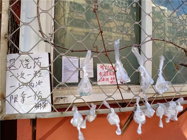 老舊的防盜窗綁著許多袋子,每袋裝著幾片退燒藥……